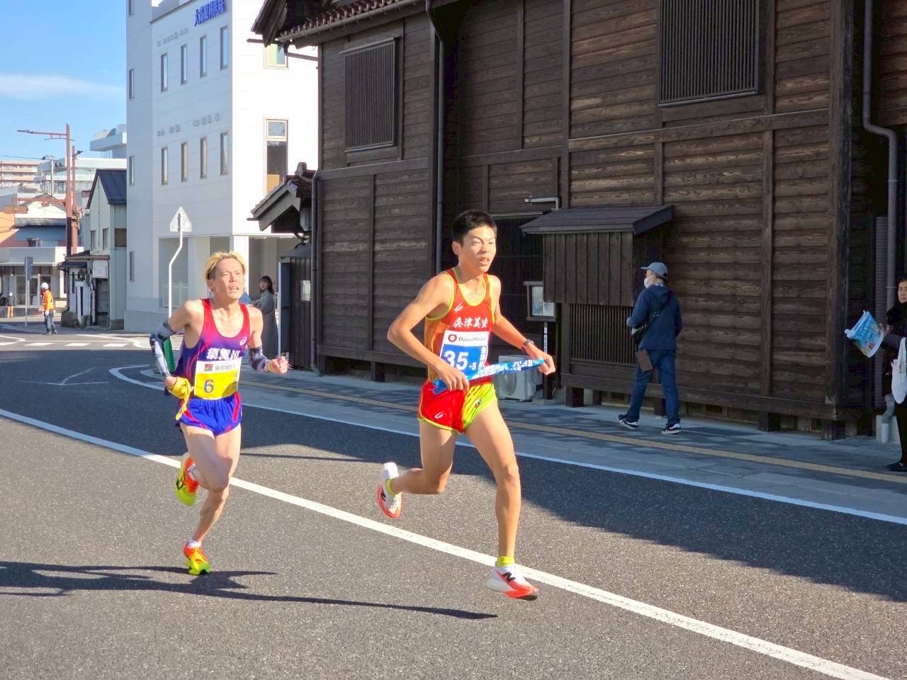 続く、5区の小林選手は、好調を維持し、勢いあふれる快走で区間賞を獲得し、町の部トップに浮上。